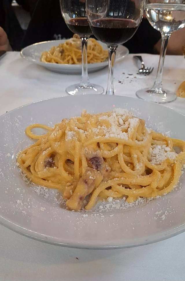 - Spaghetti “carbonara” with eggs, ppork cheese, parmigiano and pecorino cheese