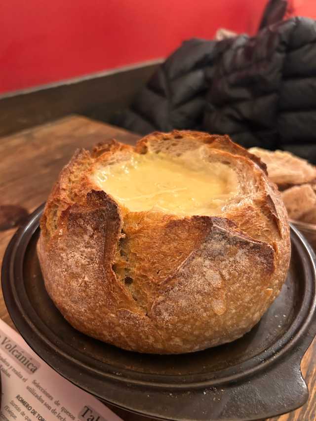 - 3 quesos: brie, rochebaron, reblochon gratinados y pan de coca