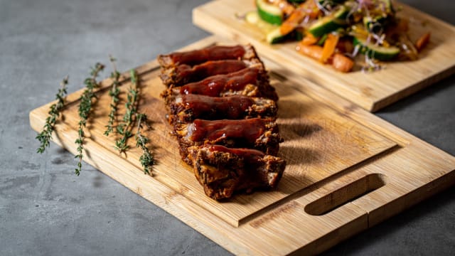 Piano assado lentamente por 4 horas em baixa temperatura, resultando em uma carne suculenta e macia, servido com molho barbecue artesanal