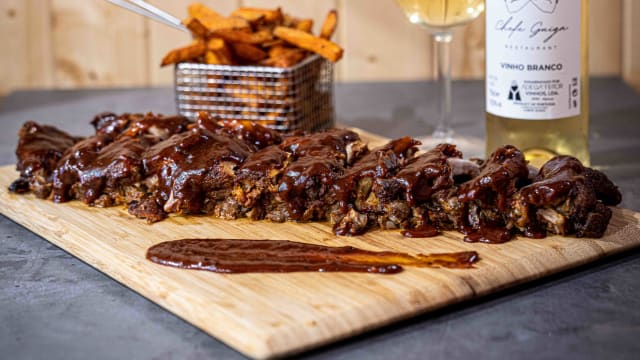 Corte nobre grelhado com osso, finalizado com manteiga de alho e servido com molho barbecue e maionese de alho e ervas