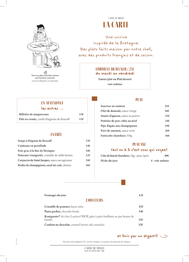 Thank you so much for your kind words! We’re delighted you enjoyed our neighborhood atmosphere and our French, Breton-inspired cuisine. It means a lot to us that your visit to Paris included a good moment at our table. We hope to welcome you again on your next trip — the fireplace will be waiting for you! The Cherche Minuit team