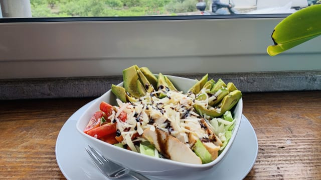 Lattuga, pomodoro, mozzarella, pollo, mais, scaglie di parmigiano