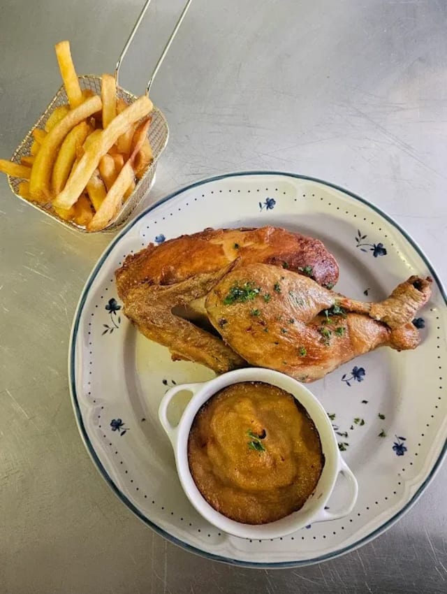 Servi avec frites et compote + une glace en dessert