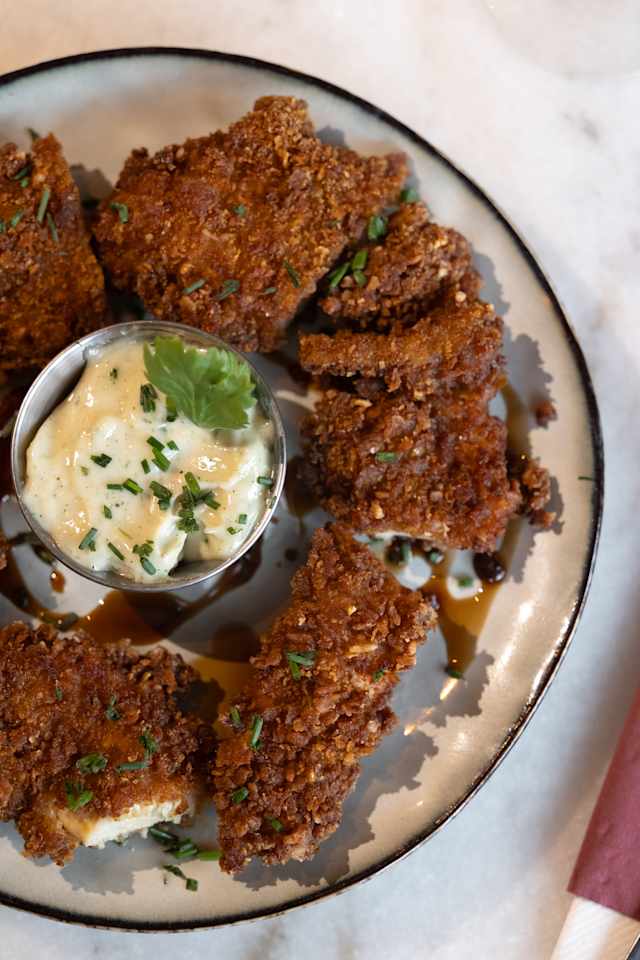 - Champignon pané, sauce ratatouille, taillade de choux blanc et rouge, pickles d’oignons rouges
