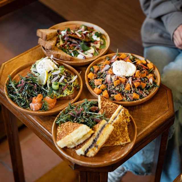 - Avocat, cream cheese, oeuf poché, radis concombre mariné, sésame grillé, roquette.