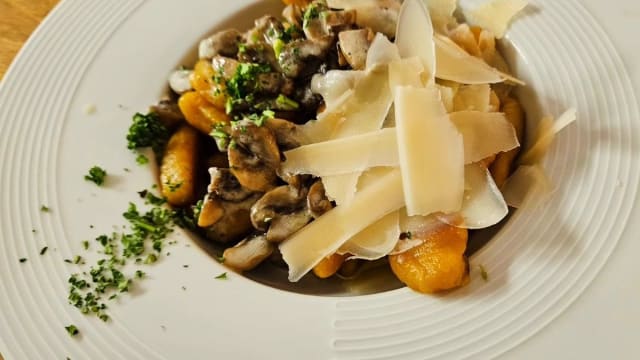 - Pleurotes, Champignons de Paris, ail, marrons, noisettes torréfiées et croûtons de pain.
