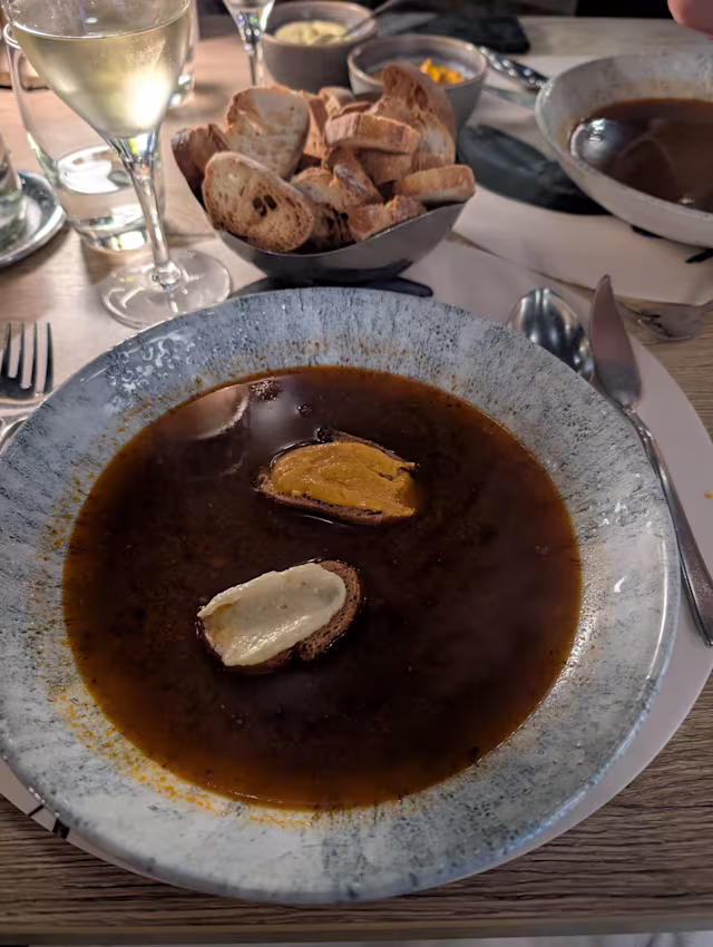 Authentic bouillabaisse! Delicious wine recommendation to accompany the soup. Very enjoyable evening!