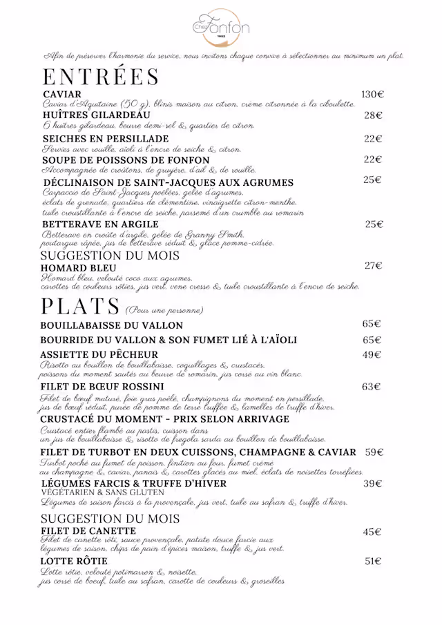 I booked Chez Fonfon for a group of 10 international colleagues and the service and food were excellent. The restaurant is calm and elegant with a beautiful view. They were very patient with people of different native languages and accents and explained the food choices thoroughly. The wine choices were also excellent and we all had a very enjoyable experience.