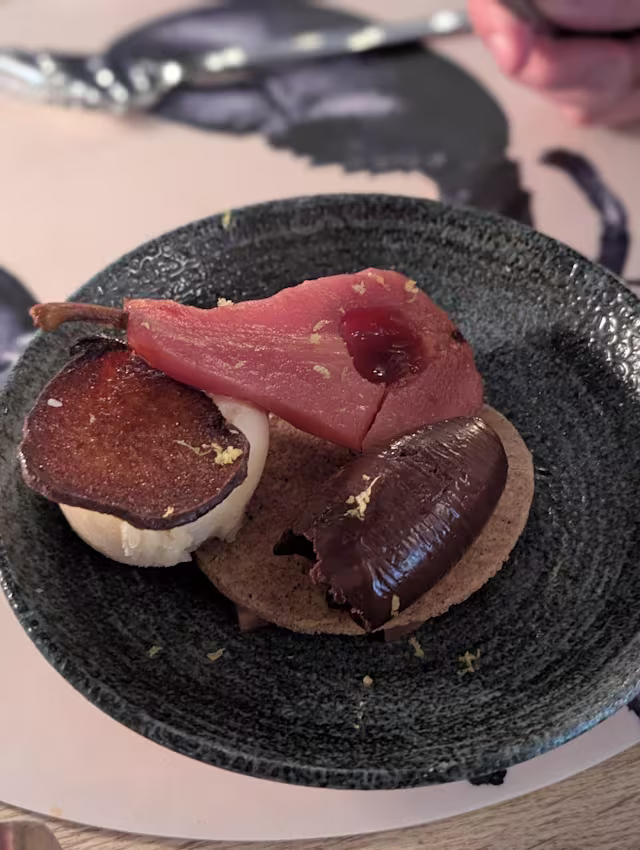 - Poire pochée au sirop de cannelle, badiane & hibiscus, ganache au chocolat noir, biscuit sablé à la cannelle & badiane, chips de poire, sorbet poire.