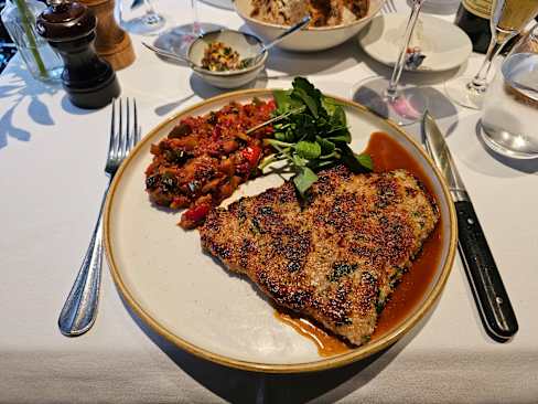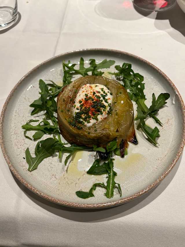 8/10I had high expectations however the food was just ok. We ordered the grilled eggplant and the “crispy veal that will melt in your mouth”. The veal was very dry and was not crispy at all. Service was good, tho we were the first customers.