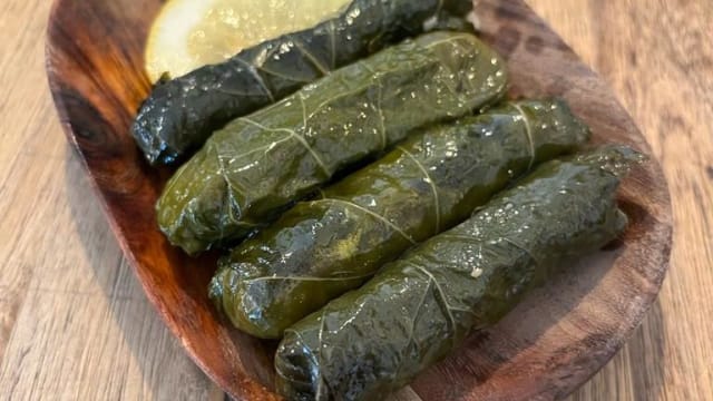 2 mezzes froids et 2 entrées chaudes au choix, boulgour ou riz, feuille de vigne, crudités