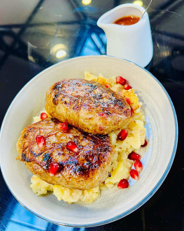Boulettes de viandes (boeuf ou porc) légérement épicées, poivre, grenade, oignons, servie avec une sauce tomate traditionnelle maison et écrasé de pomme de terres sur échalottes poëlées.