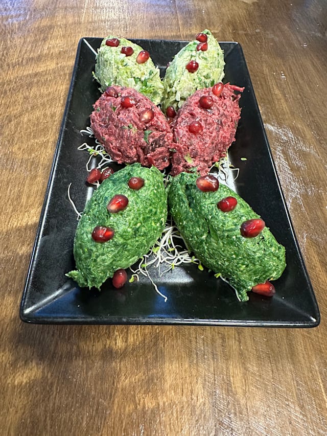 Bettrave, épinards aux noix, poireaux aux épices géorgiens.