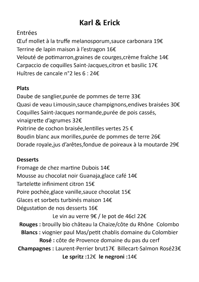 10/10Decided to try this place out because it was recommended by a friend. The food, wine, and service was fantastic! We ordered the scallop carpaccio and egg for appetizers. The scallop appetizer was soooo good! For his main course my husband ordered the filet of beef and I ordered the haddock (fish). Both were very good as were the desserts - chocolate mousse and clementines with chocolate sauce. Something unique I feel I should note is that we had a 9pm reservation and were on our way home by 10pm. While some people may find this to be a negative, we did not. As expats living in Paris we have found that dining is in Paris is something you often need to commit 2+ hours of time for, especially at the nicer restaurants. But sometimes we just want a really great meal without committing 3 hours of our evening. This was such a pleasant surprise for us at Karl et Erick. We had a wonderful dining experience and did not feel rushed at all. I'm guessing they can turn orders around quicker because the place is fairly small. Make sure you have a reservation! We are so excited to know we have a place in our neighborhood where we can get a fantastic meal and top notch service without having to commit an entire evening. Will definitely be back!