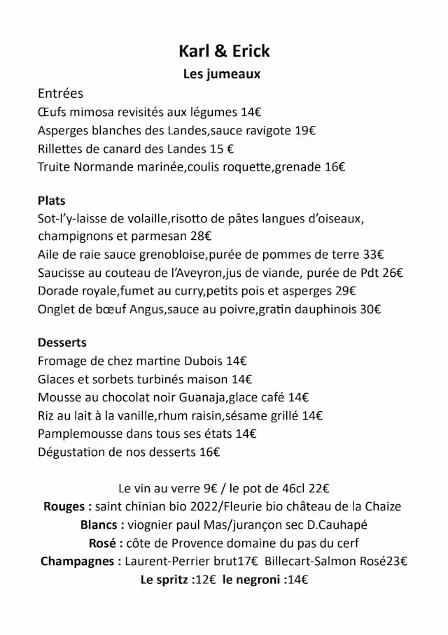 The twins Karl and Erick run a very nice restaurant together . And looked after our table of 6 very well. The food is delicious and well presented . We had some white asparagus with a very nice sauce as a starter and ray as a main course . We had all some deserts as the starters and main courses are not too large . We had three different Bourgogne wine as they only had one bottle of the first one we ordered. All of them were delicious. We will be back there as the food is just excellent!