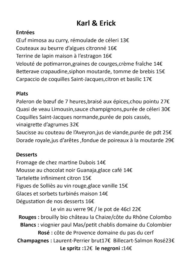 Chez Karl et Erick restaurant is located in the 17th arrondissement, not far from the famous parc Monceau. The Karl and Erick Twins give you a warm welcome in a chic contemporary space with mirrors and nice pictures. Erick, will present you the excellent cuisine of Karl that you will not forget. We ...