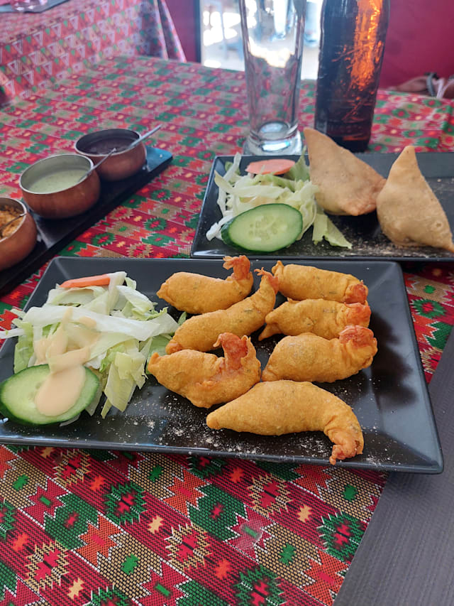 Farine de blé, farcie de poulet, oignon et épices, servi avec de la sauce népalaise