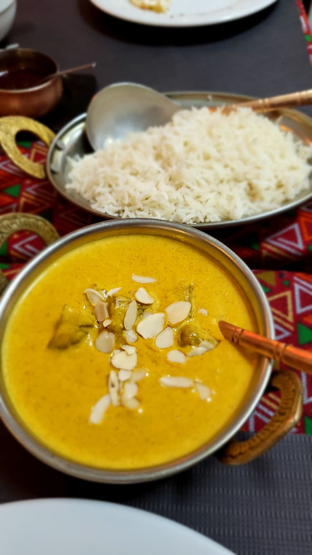 poulet en sauce amandes, raisins secs, noix de cajou et crème fraiche, oeuf et épices