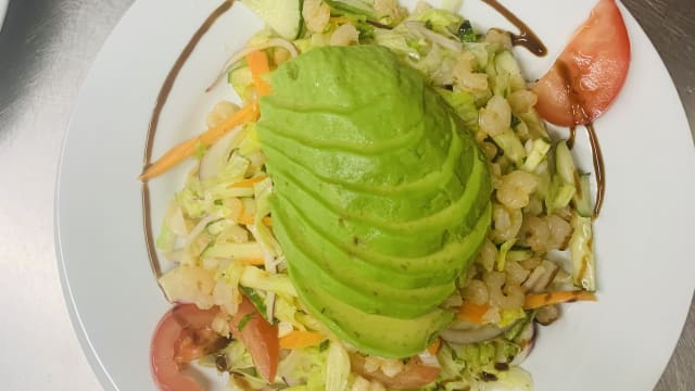Crevettes, tomates, concombre, oignons, citron et menthe fraîche, avocat