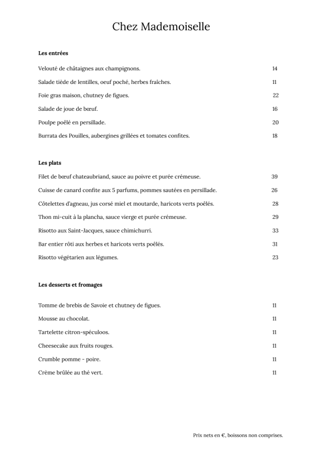 10/10On my first night in Paris this trip I was a little jetlagged and hungry so I went to Chez mademoiselle. The food was fresh and expertly prepared. The serveurs were both friendly and efficient. One even pointed me toward a store. Very welcoming and delicious food.
