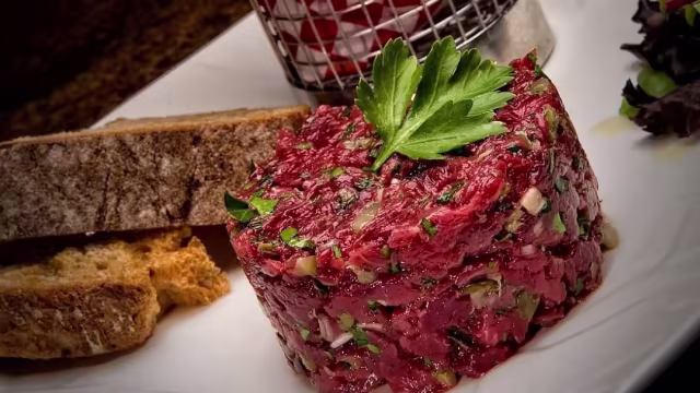 - Le tartare de bœuf au couteau de Chez Maman, aux condiments & herbes fraiches, frites