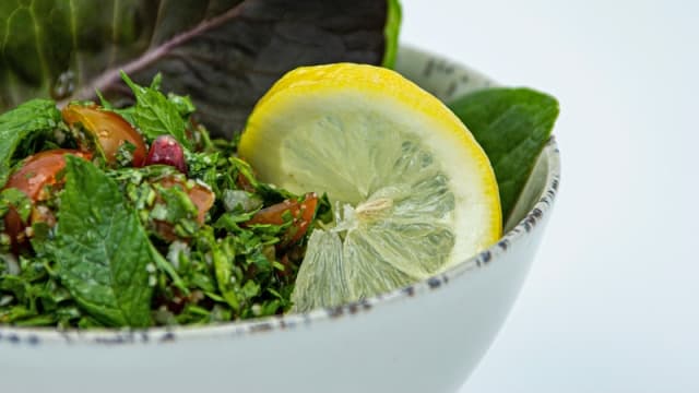 Ensalada de perejil con tomate, cebolla, granada, burgul, hierbabuena, zumo de limón y AOVE
