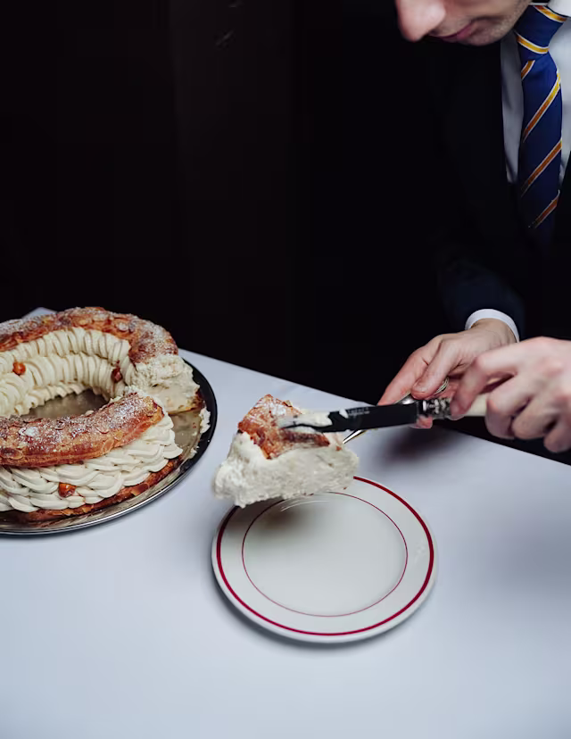 - Paris-Brest généreux, servi à la part, crème légère au praliné de noisette.