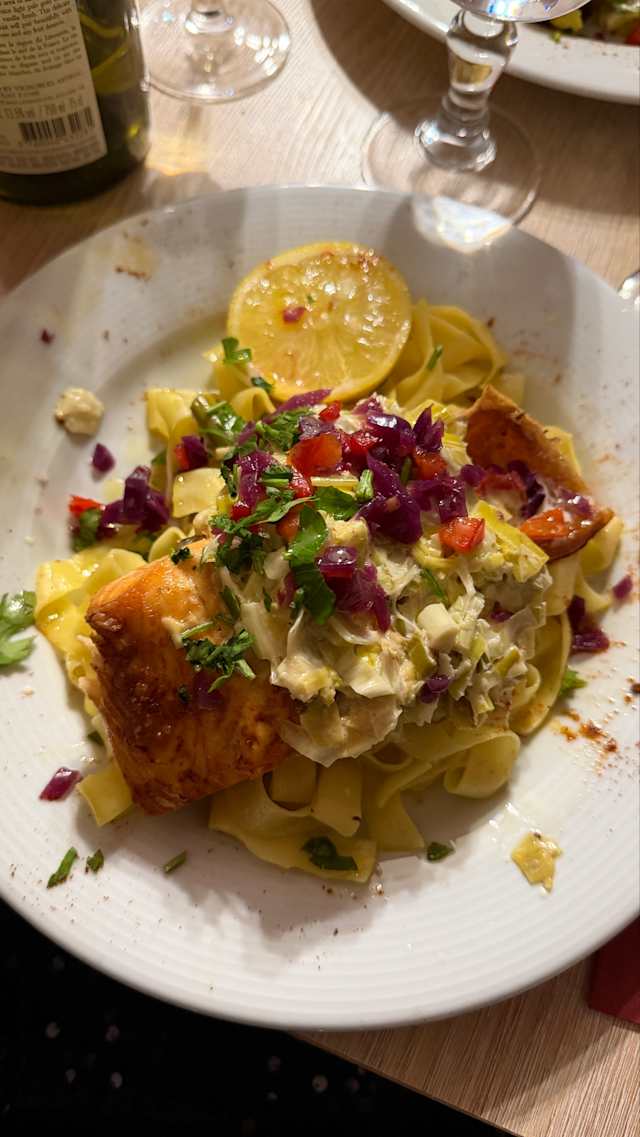 - Viande de veau hachée, poivrons, oignons, relevée de piment d'Espelette servie avec des pâtes fraîches - Fait maison