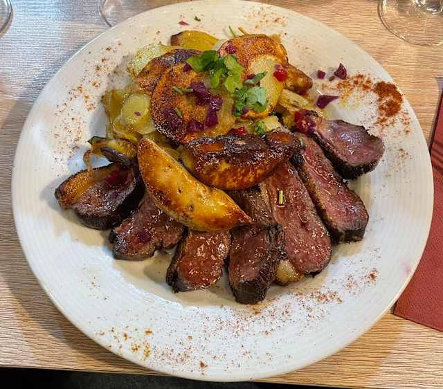 - Salade, patates sautées, foie gras de canard poêlé, magret de canard fumé, aiguillettes de canard poêlées