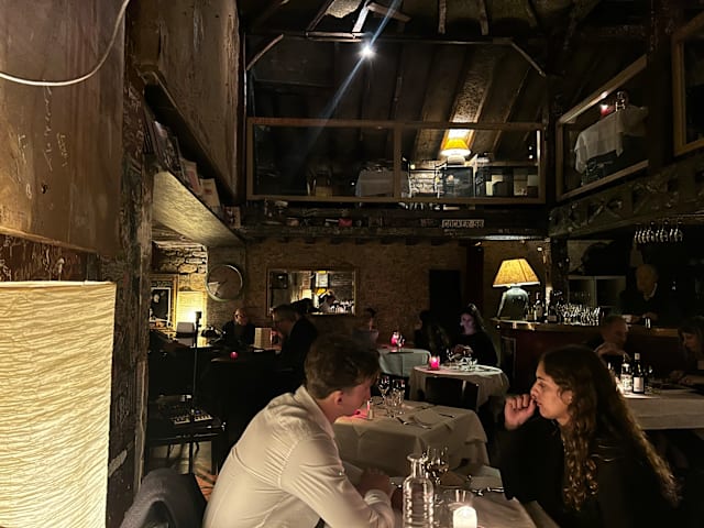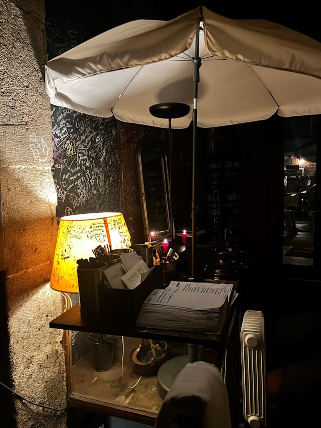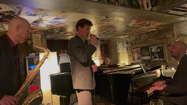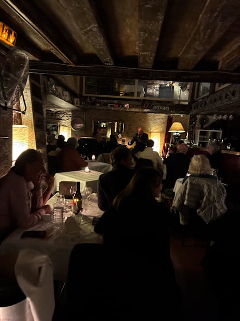 4.5/10I am writing in English. First, they do not accept credit cards and cash only. We ordered a bottle of Sancerre and the waitress brought it to the table with the cork mostly out of the bottle and she did not present it to us. It tasted like a very cheap vin ordianire and not a Sancerre. We both had the burrata and tomato salad. Kind of bland and the bread accompanying was the worst baguette ever. Then my husband had the scallops which when served were cold and I had the gambas which were OK. We arrived early 7:25 and we were charged for the live jazz that did not begin until 8:30. We had understood that this was includd if one had dinner. Nice ambiance but I would suggest going for a drink and listening to the jazz and not dinner. Improvements are needed. And although the piano player was excellent and the jazz singer good they relied on old reliable hits and did not have anything "cutting edge" jazz or new, in their first set that we heard before leaving and paying a hefty bill.