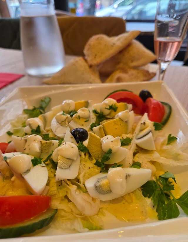 Mélange de salade verte, tomates, concombres, oignons rouges, persil, carottes, radis, grenades, menthe, falafel et sa vinaigrette citronnée.