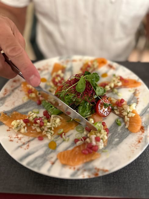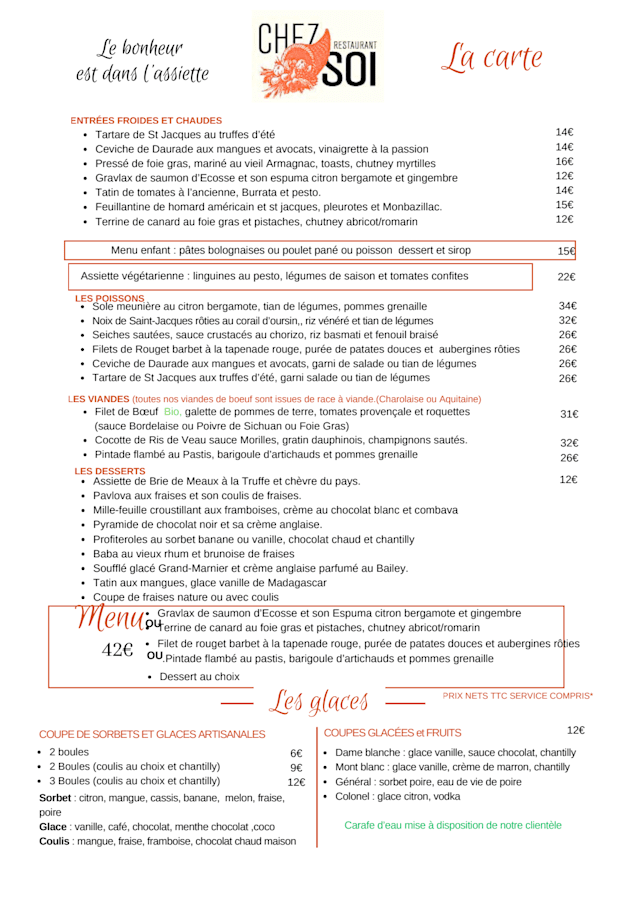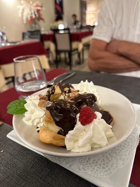 10/10+1Delightful Dining Experience I recently had the pleasure of dining at Chez Soi, and the experience was nothing short of exceptional. The restaurant’s chic and stylish ambiance set the perfect tone for an unforgettable meal, blending sophistication with a cozy, welcoming vibe. My husband opted for a three-course-menu (starter+main dish+dessert). The starter was “Gravlax de Saumon” which beautifully presented and bursting with flavour. The main dish was “Fillet de Daurade”. The dish was elevated by a rich, savory sauce that complemented the fish beautifully, balancing the subtle sweetness of the seafood with a burst of tangy, herby flavors. For the main course, I chose “Cocotte de ris de veau sauce morilles “ which exceeded all expectations. The portion was just right, and the flavors were rich and well-balanced though I was hoping to have more “morilles slices” in the sauce. To finish, we indulged in “Profiteroles” perfect ending to the meals. Highly recommend!!!