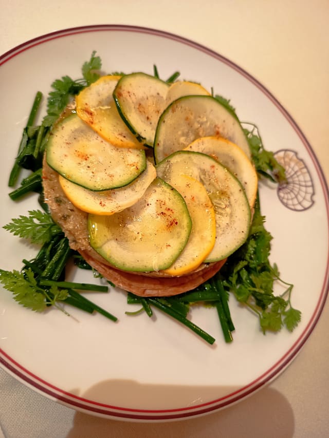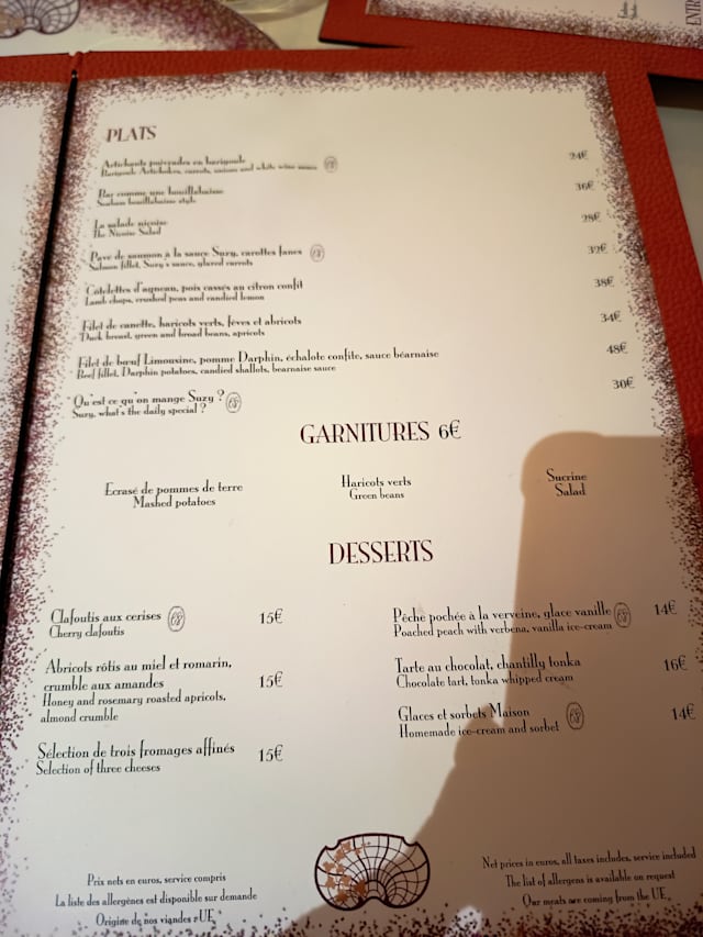 7.5/10First of all the service was excellent! The restaurant itself has a lovely open garden quality. However, they allow smoking in the restaurant which surprised me and definitely affected my enjoyment of the environment. The food was fairly unspectacular. The lobster vol au vent, while cooked fine, was served with a sauce that added no additional flavor to it, and the vegetables were a bit overcooked. The dessert a Mille feuille with raspberries was overcooked in terms of the pastry, and it came out a very dark brown and tasted almost burnt. The entrée of green beans and artichoke salad was good, but also a little on the bland side; so if you’re looking for bland food, this is the place for you but if you like food to have a lot more flavor and to have a dessert, not be partially burnt then I would not recommend Chez Suzy to you.