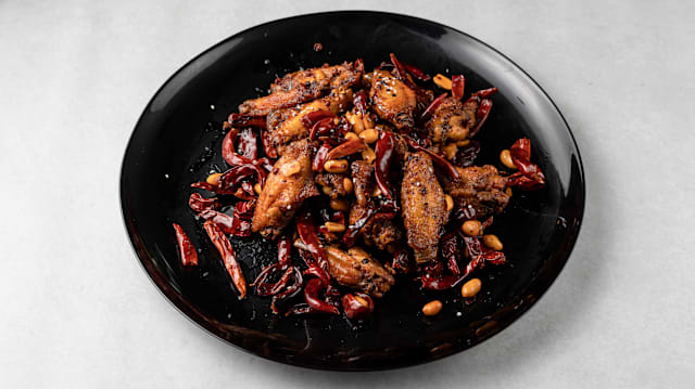 Ailes de poulet marinés croustillants étouffé dans les piments séchés, poivre de sichuan