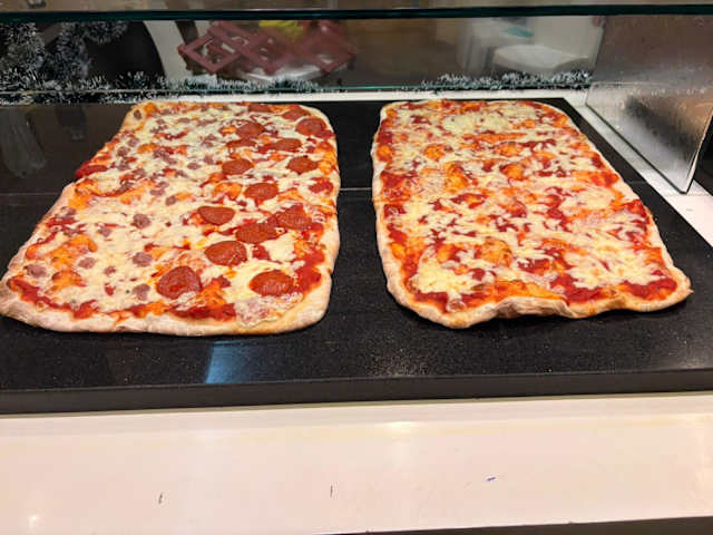 - Pomodoro, mozzarella di bufala, olive nere, salame piccante e funghi champignon