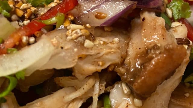 Poitrine de poulet mariné effiloché, légume de saison, avocat, haricot plat, radis blanc, concombre, sauce CMT (sauce soja (avec gluten), tamarin,huile de sésame, vinaigre de riz)