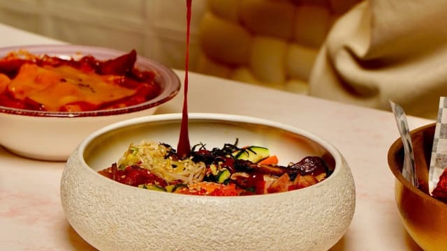 Arroz acompañado con salchicha coreana, huevo frito, calabacin, zanahoria, kimchi, pepino, brotes de soja, seta y trozos de alga, con salsa casera de bibimbap
