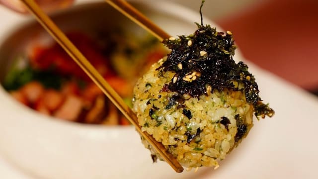 Bolas de arroz con algas y condimentado con salsa de soja, buen acompañante del chikin (3 bolas)