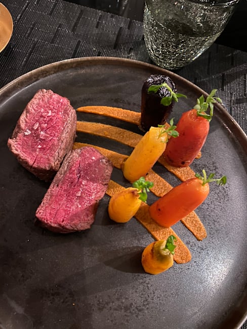 8.5/10The entree was delicious (a tiger prawn ceviche-type dish on risotto and Lima beans with a delicious ginger broth), the dessert (The Grenade) was interesting, but would never order again as the beet part was frozen solid and lacked flavor.