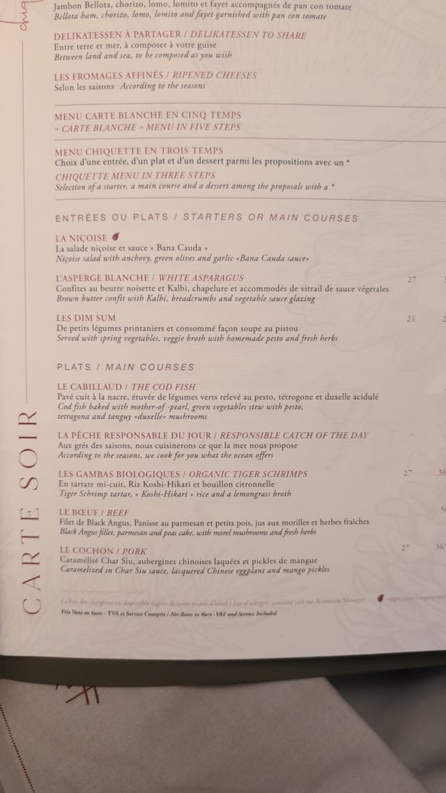10/10French and Asian flavour fusion at its finest. The low warm lighting and small space made for quite the romantic atmosphere. The subtleness of the fusion flavours were just what we expected from a French restaurant inside a 5 five star hotel. The Dim Sum and the Cod were so delicately balanced and perfectly cooked. The SmashBurger portions would make any American happy with the generous portions. I never thought I could both have the Maillard effect of the smashed beef combined with rareness that I craved with red meat. This won’t make sense until you’ve tried this yourself. All the dishes subverted our brains expectations and opened our minds to French and Asian fusion after weeks of just proper French and Italian cuisine. We highly recommend this Chiquette for an amazing romantic and gastronomic experience.