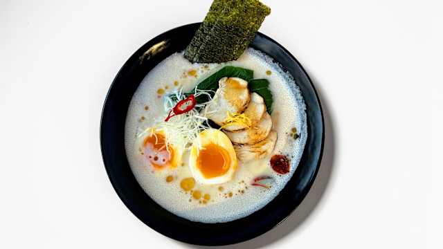 - Caldo de molho de soja, entremeada, ovo, menma e pak choi