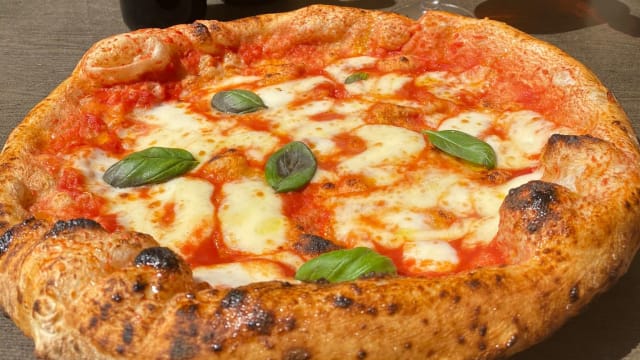 (pom. san marzano. Fior di latte dei monti lattari, olive. Carciofini. funghi champion ripassati, prosciutto crudo. Salsa di uovo pastorizzato)