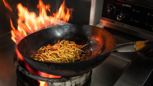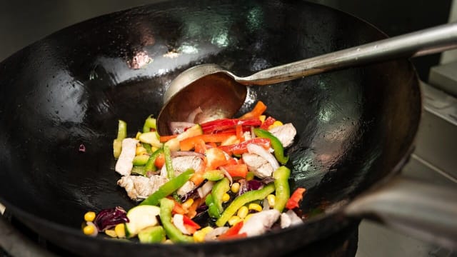 Nouilles, crevettes, calamars, poivrons, pak choï, sauce huître, huile de sésame, coriandre