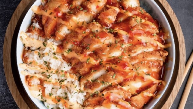 Salade, chou rouge, carottes râpées, pousses de soja, poivrons, poulet croustillant, sauce du chef, oignons frits.