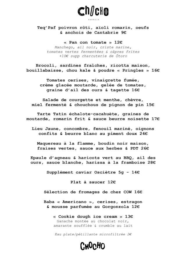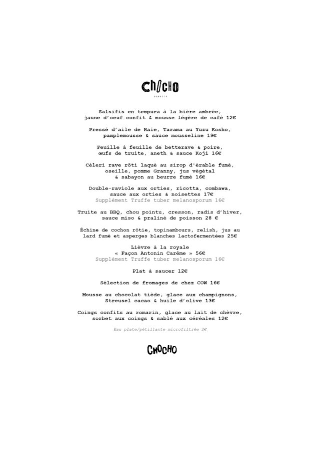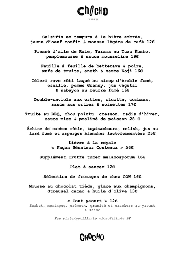 9.5/10+1Outstanding service, great food and a wine/ drink selection that is special! The dishes are bold yet simple with ingredients that are very cleverly crafted. A savoury mille-feuille with grilled mackerel and black-pudding as two layers? Amazing. The wine list is outstanding and has some real gems on it from around France mainly. And then a Chartreuse VEP as a digestif! I was most impressed though with the warm and friendly service and for that alone would recommend ChoCho for any serious lover of food, good drinks and a very pleasant atmosphere