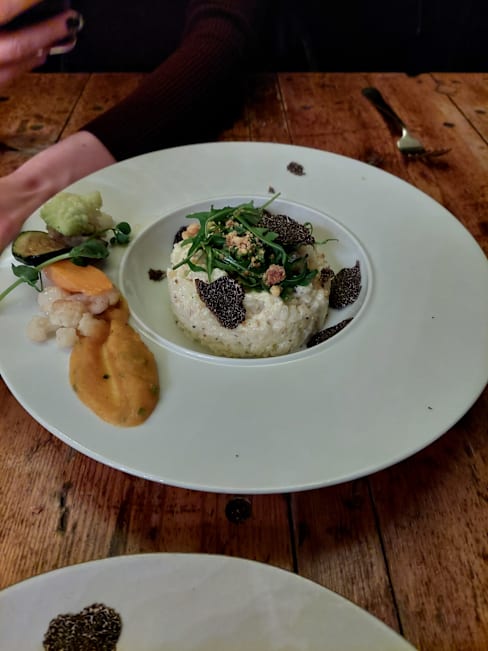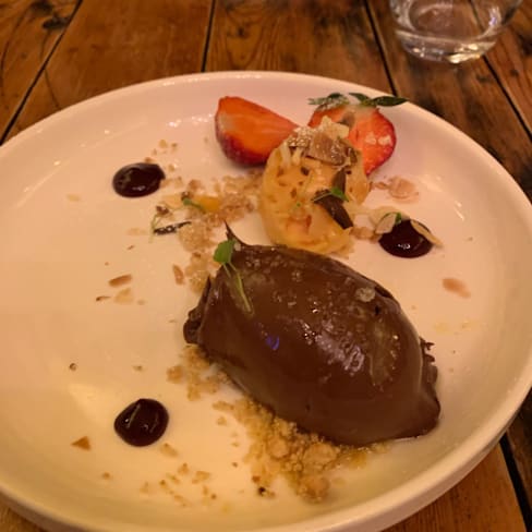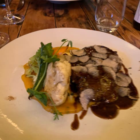 4/10Main course (the cod) was very dry. Overcooked and exposed to air for a while afterwards. The carrot was overcooked. The small piece of broccoli was between 4-5 degrees warm. The mash tasted water. The dish itself should have been served when ready. Maybe one waiter is not enough? The starter was ok, so was the desert. A noisy group next to my table made too much noise.