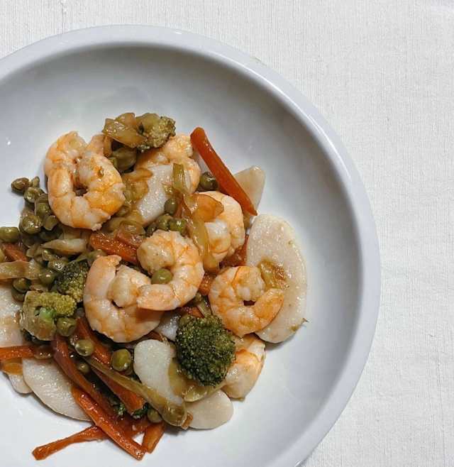 - Gnocchi di riso, gamberi, germogli di soia, fette di carota, zucchina, cavolo cinese, peperone, cipolla