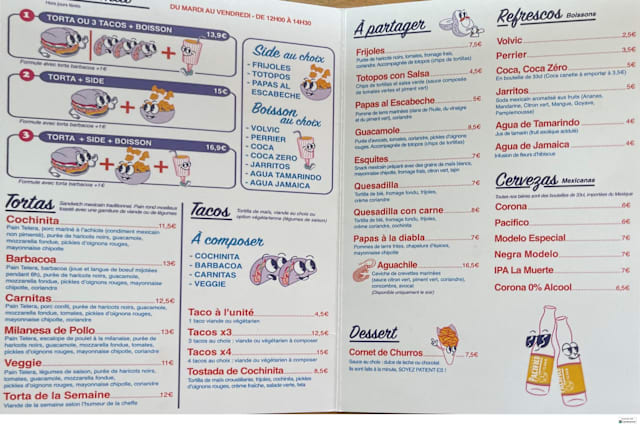 Pain telera, porc mariné à l'achiote (condiment mexicain non pimenté), purée de haricots noirs, guacamole, mozzarella fondue, pickles d'oignons rouges, mayonnaise chipotle