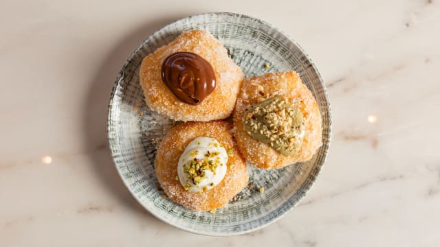 Tre zeppole assortite con ripieni di nutella, ricotta o crema di pistacchio