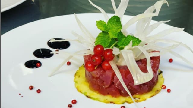 Mozzarella fior di latte, tonno fresco scottato, cipolla caramellata pomodorino confit, capperi di pantelleria
